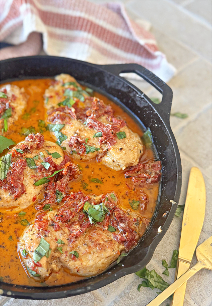 Stir in chopped sun-dried tomatoes and simmer for another 2 minutes. Return the chicken (along with the remaining sauce) to the skillet, cover, and simmer over medium-low heat for 5-7 minutes, or until the chicken is cooked through and the sauce has thickened. Sprinkle with basil before removing from heat, and adjust seasoning with salt and pepper if desired. The thicker the sauce, the more appealing it will be; for a richer consistency, simmer for a little longer.